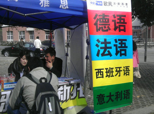11月29日南京歐風小語種在南京工業大學浦口校區人流量最大的東苑食堂舉辦了一天的戶展活動。