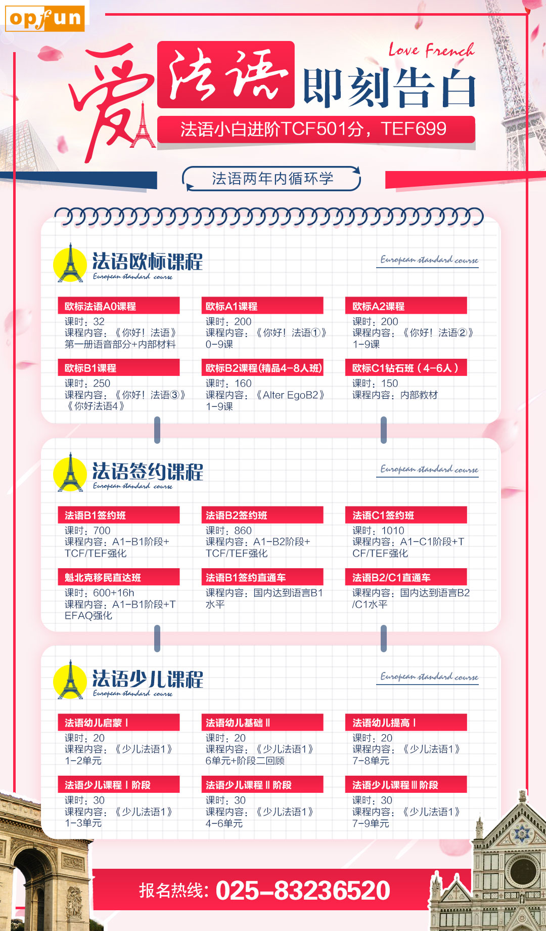 南京歐風法語培訓班怎么樣?南京歐風法語培訓,法語培訓教育,專業的法語培訓機構.小班教學,資深教師授課,0元試聽,低成本學法語就到南京歐風小語種培訓機構! ![]() 南京歐風德法西16課時入門班僅299元! 關注南京歐風外語微信公眾號:njofun520,即可獲贈280元免費試聽課,多人團報有電影票超市卡騰訊視頻會員等禮品,更有低至85折優惠哦~ 班級名稱: 法語歐標B1課程使用教材: 《你好!法語③》1-12課適合對象:有A2基礎的學員課程內容: 教學目標: 當在工作,學校及娛樂的環境時,說的清楚而標準,能理解主要的觀點。當在該語言主要適用地區旅行時遇到狀況,遇到能使自己擺脫困境。能制造簡單話題討論,緊貼生活日常主題,或在一些大家感興趣的地方。能夠描述一個事件,經歷或一個夢想,描述希望或者目標,能為了一個任務或觀點,陳述簡單的理由和解釋。 課程特色: 1. 專業:師資力量雄厚,細致講解所有核心考點,夯實基礎; 2. 生動:豐富案例精講,循序漸進的課程結構,深入淺出; 3. 定制:針對學員現有水平精準定制課程內容,因材施教; 4. 反饋:全程跟蹤學生的學習過程,對學生的學習與生活進行指導,在歐風,我們不僅僅是老師,更是學生的朋友; 5. 精準:精準剖析, 梳理學科重難點,提升應試能力; 6. 強化:單模塊課后專項練習,專業評講; 歡迎同學們前來南京歐風預約免費的試聽課程,滿意后在選擇報名哦。預約試聽課