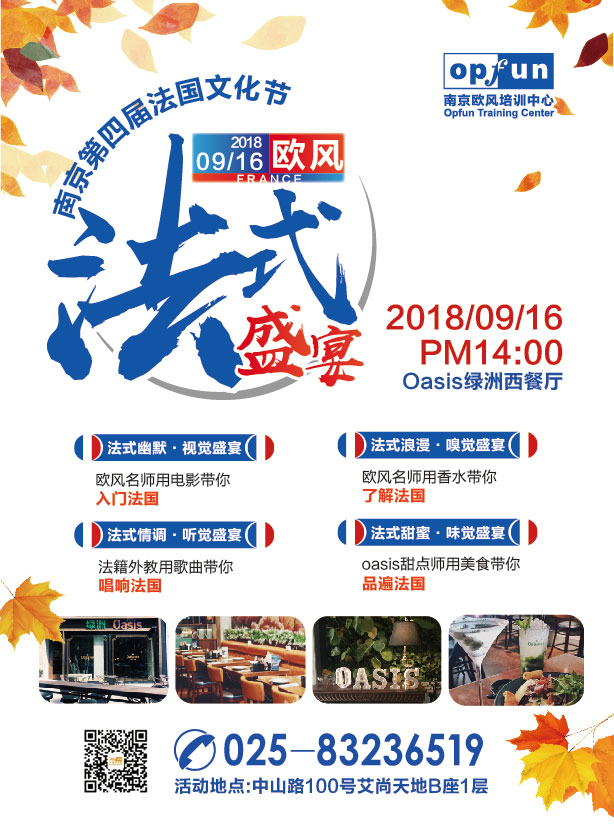 法式幽默·視覺(jué)盛宴 法式浪漫·嗅覺(jué)盛宴 法式情調(diào)·聽(tīng)覺(jué)盛宴 法式甜蜜·味覺(jué)盛宴 主辦方:南京歐風(fēng)小語(yǔ)種培訓(xùn)中心 場(chǎng)地支持:Oasis綠洲西餐廳 時(shí)間:2018年9月16日14:00-16:00(周日) ![]() 1. 講座環(huán)節(jié)(共計(jì)120Min) Part 1 視覺(jué)盛宴 30Min 10min電影《天使愛(ài)美麗》片段賞析+10min電影片段法語(yǔ)入門(mén)教學(xué) 期間準(zhǔn)備5個(gè)電影內(nèi)小問(wèn)題 互動(dòng)作答 獎(jiǎng)品:德基電影兌換券1張 共5張 Part 2 嗅覺(jué)盛宴 30Min 講解法國(guó)香水文化香水品鑒 期間互動(dòng)香水小游戲 獎(jiǎng)品 :法國(guó)香水小樣1瓶 共5瓶 Part3 聽(tīng)覺(jué)盛宴 20Min 法籍外教法語(yǔ)歌曲教學(xué)互動(dòng) 獎(jiǎng)品 :溫莎KTV 500元房費(fèi)抵用券1張 共5張 Part 4 味覺(jué)盛宴 40Min 講解法國(guó)紅酒史與甜品介紹 期間互動(dòng)紅酒小游戲 獎(jiǎng)品 :法國(guó)布朗尼小蛋糕1盒 共5盒 二、現(xiàn)場(chǎng)抽獎(jiǎng) 一等獎(jiǎng):任意語(yǔ)種¥6000隨聽(tīng)卡1張 二等獎(jiǎng):HERMES花園香水禮盒套裝1盒 三等獎(jiǎng):【法國(guó)波爾多梅多克四級(jí)莊】紅酒1瓶 |