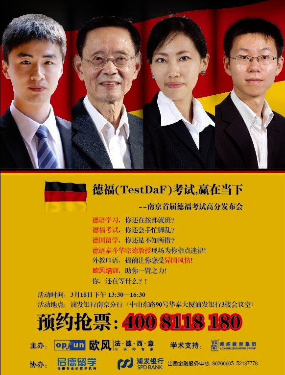 德福考試,你還會手忙腳亂? 德國留學,你還是不知所措? 德語泰斗華宗德教授現(xiàn)場為你指點迷津!外 教口語,提前讓你感受異國風情! 歐風培訓,助你一臂之力!你,還在等什么?! ![]() 現(xiàn)場豪禮