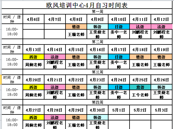 3月起教務(wù)部將提供學(xué)員增值服務(wù),每天安排固定時(shí)間供學(xué)員自習(xí)答疑,按月度出時(shí)間表。附件為3月自習(xí)時(shí)間表。 歐風(fēng)自習(xí)室:固定老師答疑,營造濃厚學(xué)習(xí)氛圍