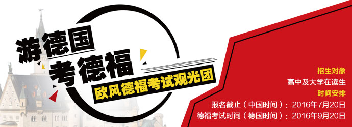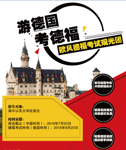 德福考試觀光團 開始報名咯! 德福考試觀光團行程安排 u 時間安排: 報名截止(中國時間):2016年7月20日; 招生對象:高中以及大學在讀生; 德福考試時間(德國時間):2016年9月20日。 u 行程安排: Day 1 9 月 16 日 上海出發,經停北京,飛德國(杜塞爾