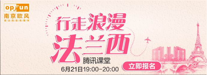 騰訊課程第30期法語講座——行走浪漫法蘭西,具體內容如下 講座主題:行走浪漫法蘭西 講座時間:6月21日19:00-20:00 講座形式:騰訊課堂直播課程 報名地址:https://ke.qq.com/course/216675 歡迎撥打咨詢熱線:025-83236520 QQ:120095421