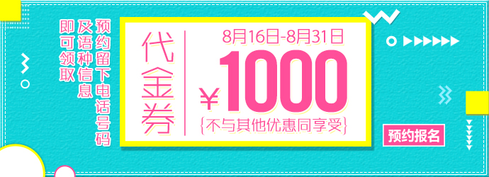 微信/微博/大眾點(diǎn)評(píng)可以使用:8月16日-8月31日,預(yù)約留下電話號(hào)碼及語種信息,即可領(lǐng)取1000元代金券(學(xué)費(fèi)金額滿1萬元使用)